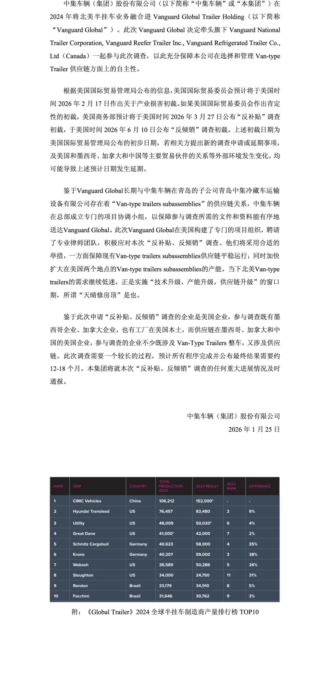 关于北美子公司参与美国商务部针对墨西哥、加拿大和中国生产的 "Van-Type Trailers and Subassemblies Thereof"发起的反补贴、反倾销调查